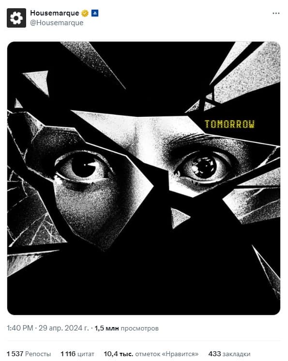 Вдаваясь в подробности, студия Sony поделилась изображением с двумя глазами, разделенные рядом фрагментов, и лаконичной надписью «завтра», выделенной желтым цветом.