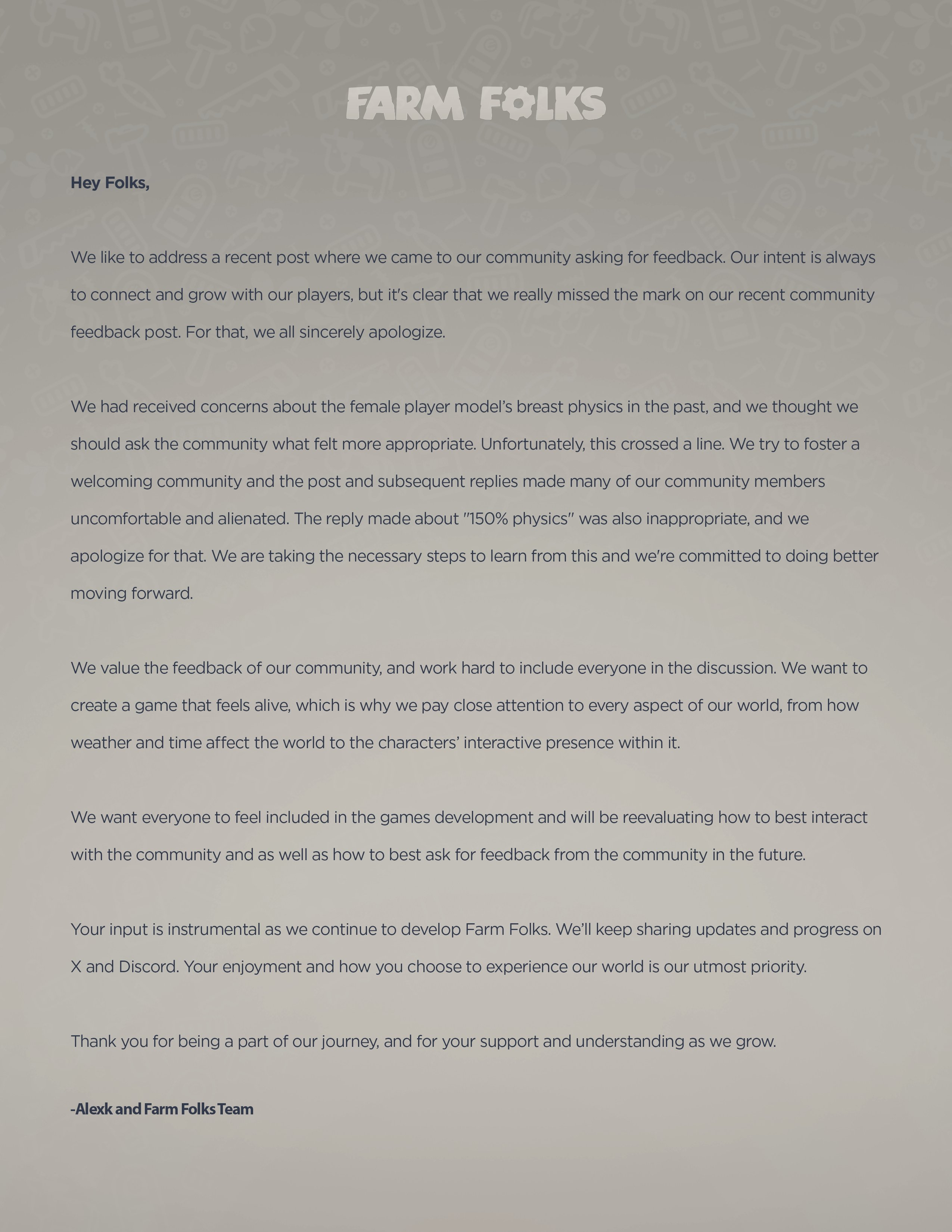 Вскоре Crytivo решила выпустить заявление: авторы Farm Folks извинились за свои действия. Также они назвали «неуместными» комментарии некоторых пользователей с просьбой выкрутить физику груди на 150%.