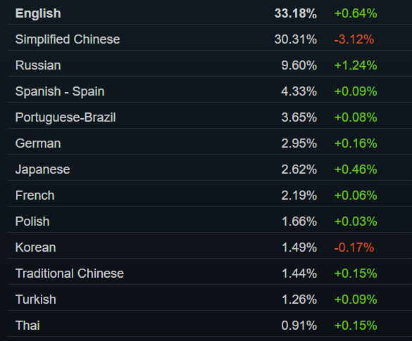В апреле «языковая ситуация» в Steam изменилась. Ранее «материковый» китайский был на первом месте, а теперь язык №1 — это английский. Упрощённый китайский располагается на втором месте, а русский язык замыкает тройку лидеров среди самых популярных языков в сервисе Valve.