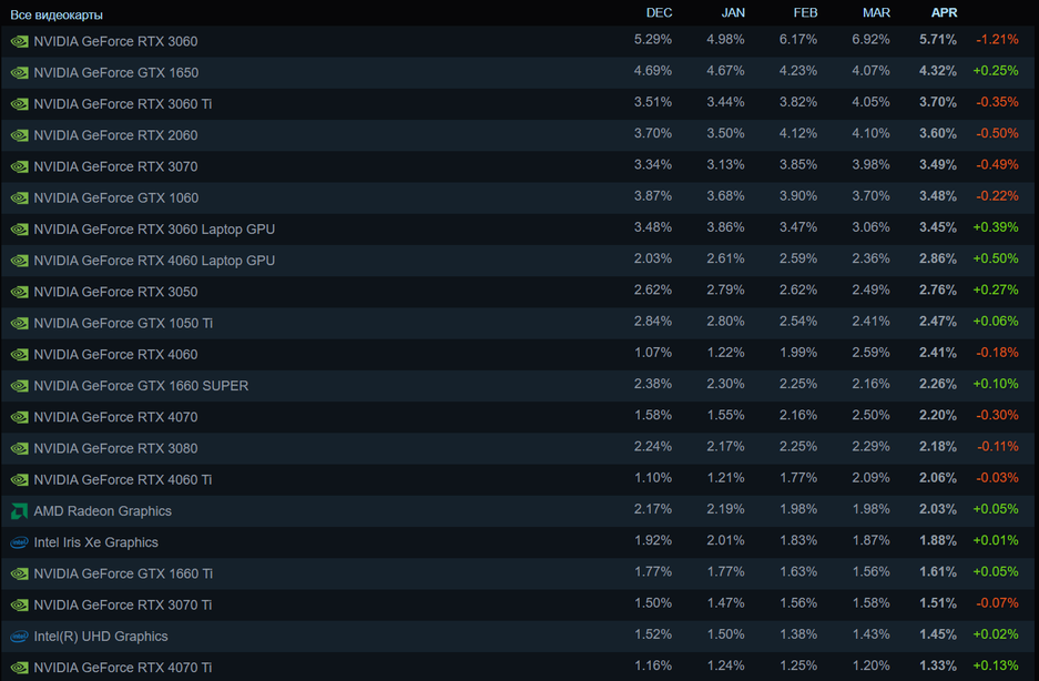 - NVIDIA GeForce RTX 3060 — 5.71% (падение доли -1.21%)