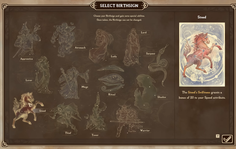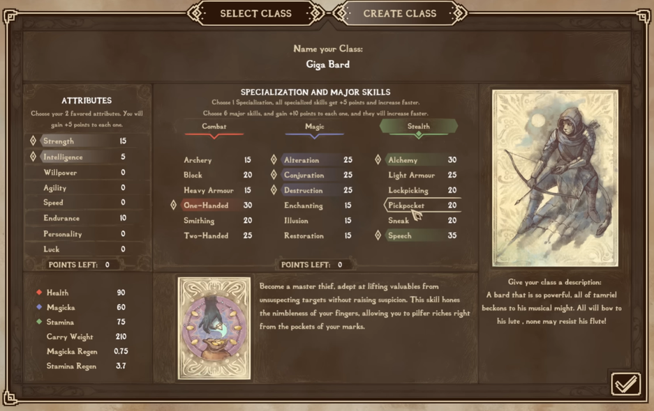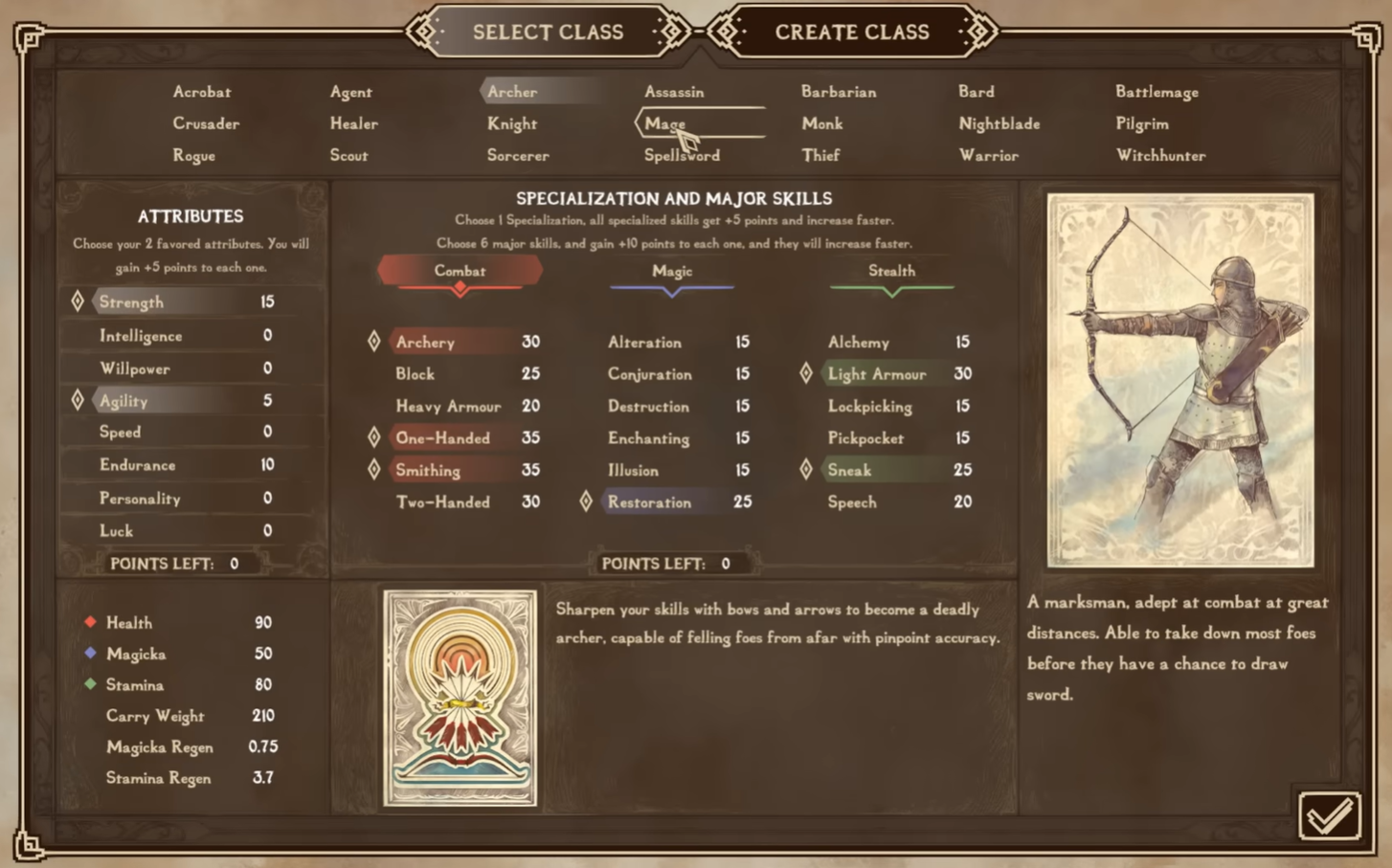 Классовое меню выглядит следующим образом — можно выбрать из представленных в списке, или же сделать свой собственный класс и самостоятельно задать описание. Вернулись атрибуты, которые были представлены в Oblivion, но убраны в Skyrim.