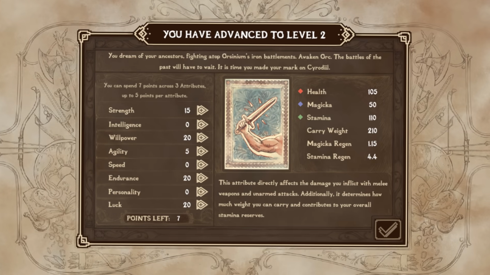 Правила Oblivion сохраняются: повышение уровня можно осуществить только когда герой ложится спать.