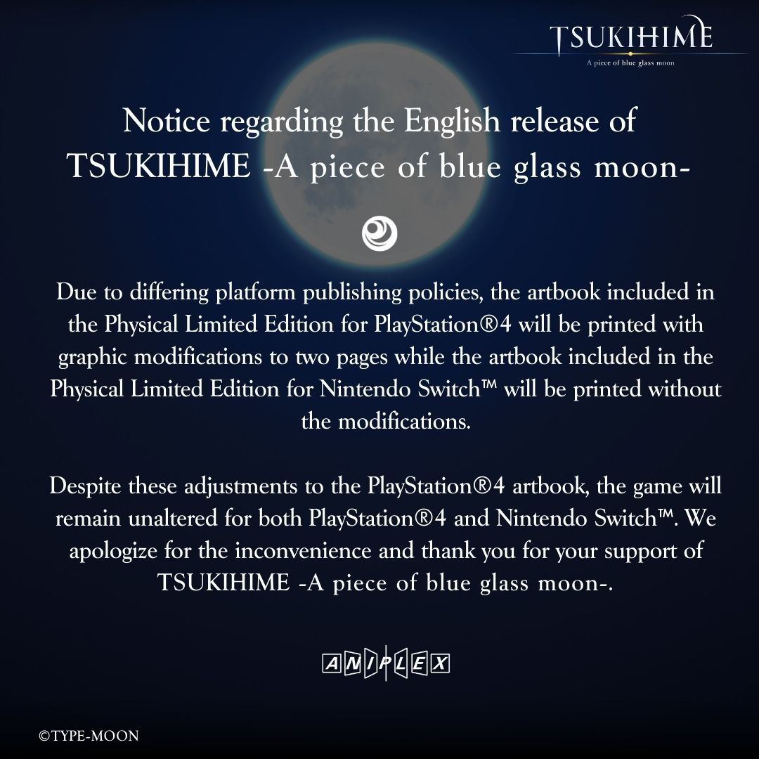 «Из-за различий в издательской политике платформ артбук, входящий в состав физического ограниченного издания [Tsukihime: A Piece of Blue Glass Moon] для PlayStation 4, будет напечатан с графическими изменениями для двух страниц, в то время как артбук, входящий в состав издания для Nintendo Switch, будет напечатан без изменений».