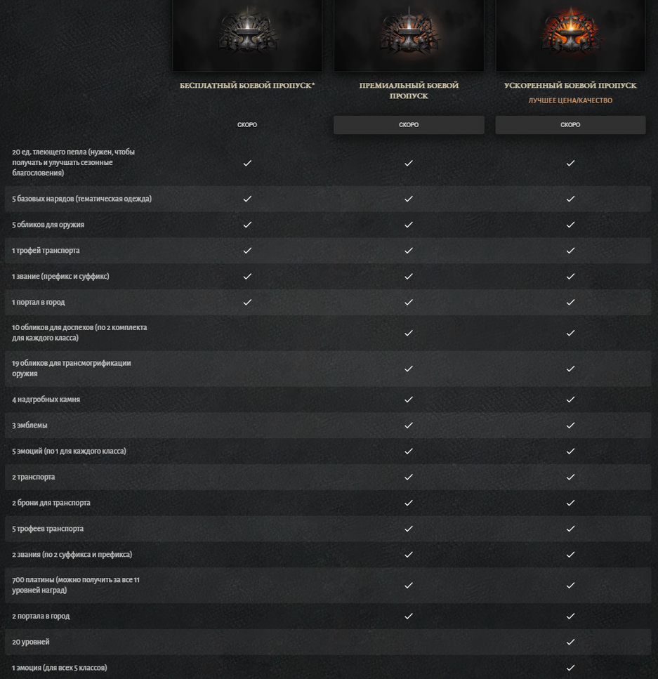 - Облики оружия, городские порталы, эмоции, платина и многое другое: «Примерьте декоративные награды, которые можно получить с премиальным боевым пропуском. Соберите облики для всех 19 типов оружия. Не забудьте и про своего коня — украсьте его 5 новыми трофеями для транспорта. Каждый класс получит по 1 новой эмоции, чтобы вы могли продемонстрировать вашу силу. А 4 надгробных камня украсят вашу могилу... пока вы из нее не выберетесь».