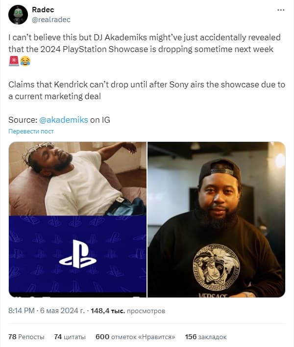 «Невероятно, но DJ Akademiks, возможно, только что случайно раскрыл, что PlayStation Showcase 2024 состоится на следующей неделе. Он утверждает, что Кендрик не может выступить перед трансляцией шоукейса Sony из-за текущей маркетинговой сделки».
