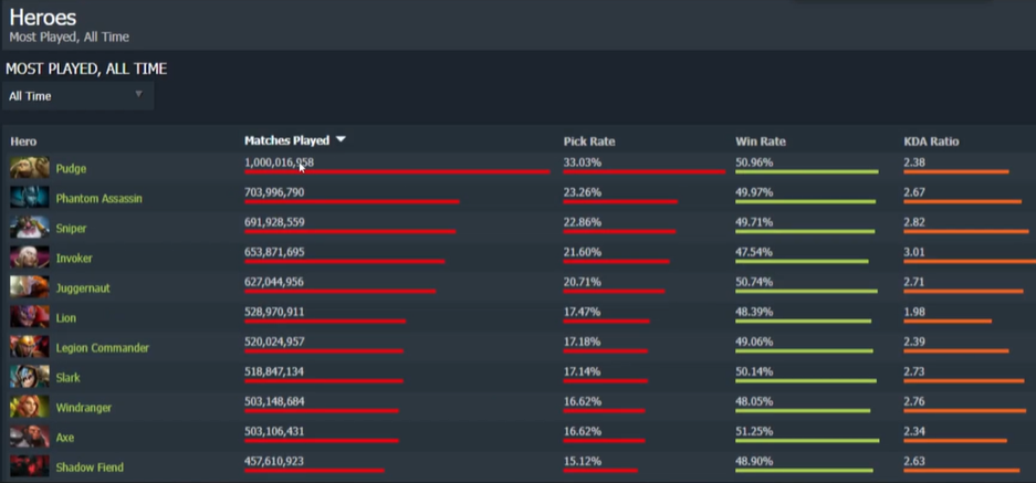 Сервис Dotabuff зарегистрировал свыше 1 миллиарда матчей на Pudge, при этом процент побед чуть больше 50%.