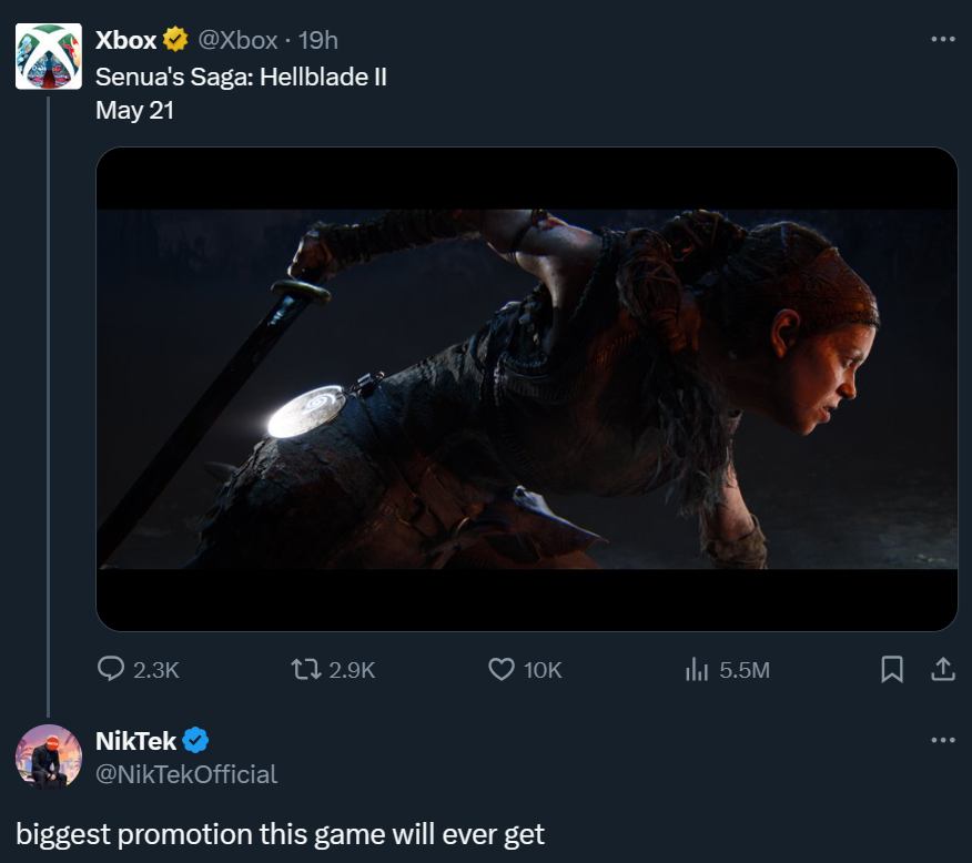 В этот день действительно что-то началось, но пока это «нечто» работает против Senua’s Saga Hellblade 2. Дело в том, что в социальной сети в аккаунте Xbox показали «новый скриншот» — внимательные геймеры довольно быстро вспомнили, что это старое промо-изображение.