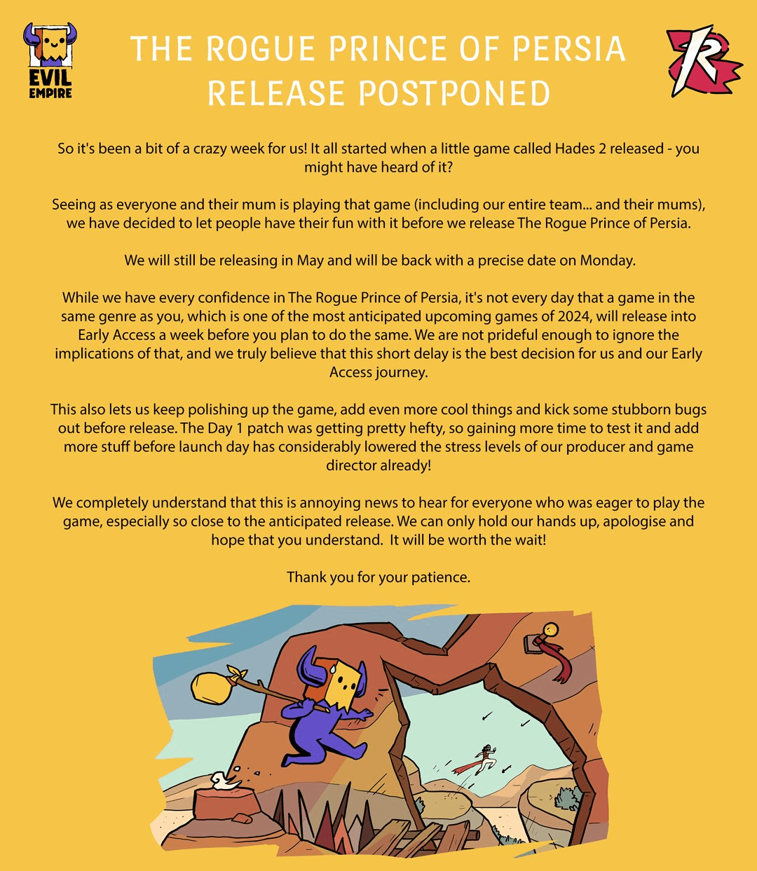 Некоторые разработчики сделали выводы и решили отложить выпуск своих игр, в том числе и авторы новой игры по франшизе Prince of Persia. Команда Evil Empire, известная по дополнительному контенту для Dead Cells, ранее собиралась выпускать The Rogue Prince of Persia 14 мая 2024 года.