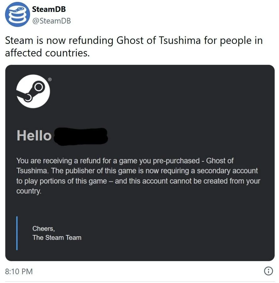 Незадолго до релиза ПК-версии Ghost of Tsushima издатель Sony (PlayStation PC LLC) изъял игру из продажи в 170+ регионах, включая Казахстан, где не представлены сервисы PSN (одиночной игре они не нужны, а для мультиплеерной части — требуется привязка). Затем началась процедура принудительного возврата средств тем, кто успел оформить предзаказы на игру.