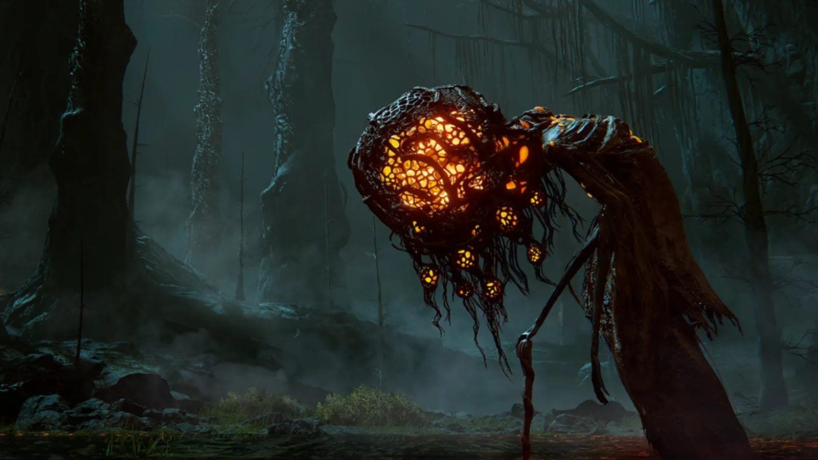 На изображении, сопровождающем анонс, показано зловещее существо с дизайном, напоминающим характерную эстетику FromSoftware: скелетные конечности, разорванный плащ и светящаяся торчащая голова.