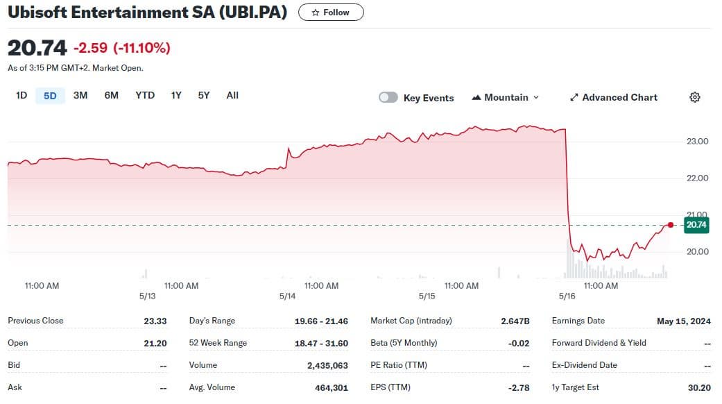 Цены акций Ubisoft улетели в крутое пике после анонса Assassin's Creed Shadows, и продавались в определенный момент по 19,78 евро (-15%). Это было крупнейшее падение стоимости ценных бумаг компании за последние 16 месяцев.