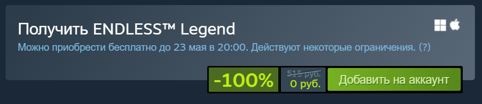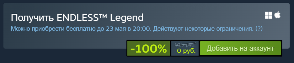 Ожидается, что раздача Endless Legend продлится в Steam до 23 мая, 20:00 по московскому времени. У игры есть коллекционные карточки Steam — получившие игру через данную акцию не смогут их выбить (но значок сделать это не помешает, их продают на торговой площадке Steam и можно изготовить самостоятельно).
