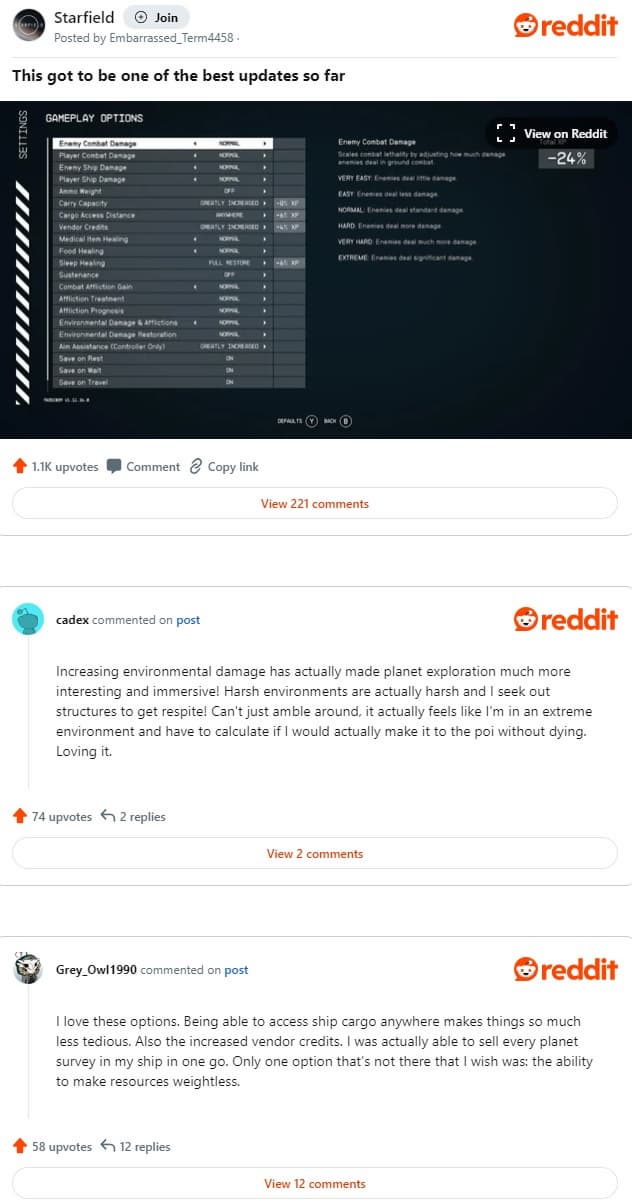 В частности, высоко оценена возможность настраивать игру в соответствии с собственными предпочтениями, что свидетельствует о стремлении Bethesda выпускать контент, отвечающий ожиданиям сообщества. Кроме того, появилась возможность играть в 60 FPS на Xbox Series X, что стало большим шагом вперед, поскольку внимание наконец-то сосредоточили на оптимизации игры. Обновление также включает ряд других изменений, таких как улучшение карты, качества текстур, новые варианты диалогов и возможности в строительстве кораблей. Bethesda также не забыла о стабильности и производительности – внесены общие исправления и улучшения.
