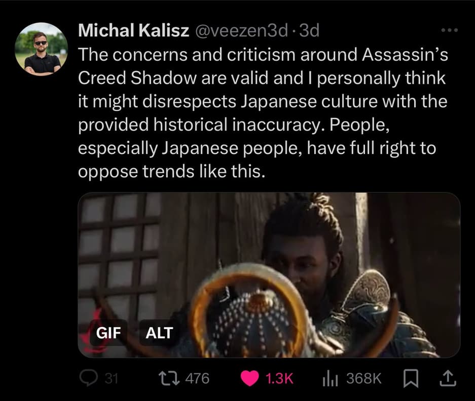 После анонса Assassin's Creed Shadows многие члены игрового сообщества оказались недовольны творческим видением Ubisoft, решившей сделать одним из главных героев игры про Японию и японскую культуру чернокожего паренька. Протестующих против повестки поддержал художник CD Projekt Михал Калиш, написавший на своей странице в социальной сети X следующее: