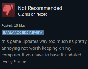 Недовольный пользователь пишет: «Эта игра обновляется слишком часто, это довольно сильно раздражает; это не стоит держать на моём ПК, если требуется обновление каждые 5 минут».