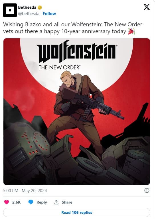 20 мая 2024 года Bethesda Softworks сообщила о десятой годовщине выхода Wolfenstein: The New Order, игры, которая, по мнению отдельных геймеров, изменила облик боевиков и шутеров.