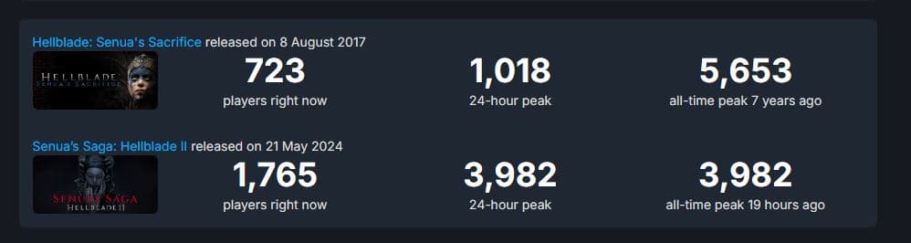 Пиковый онлайн Senua's Saga: Hellblade 2 за сутки после релиза так и не преодолел отметку в 4 тысячи игроков, продемонстрировав результат хуже, чем в свое время оригинальная Hellblade, в которую играли более 5,6 тысячи человек.