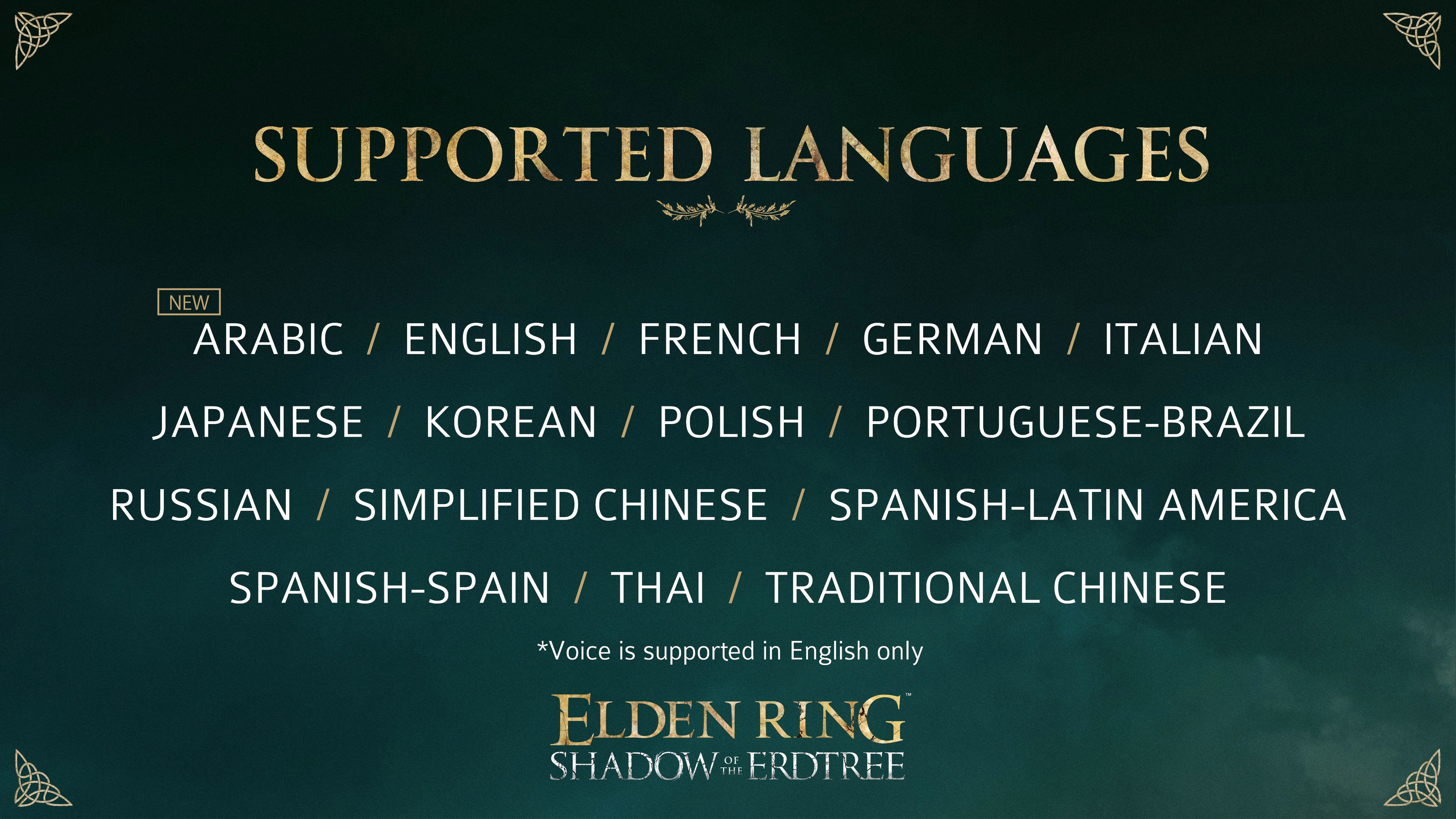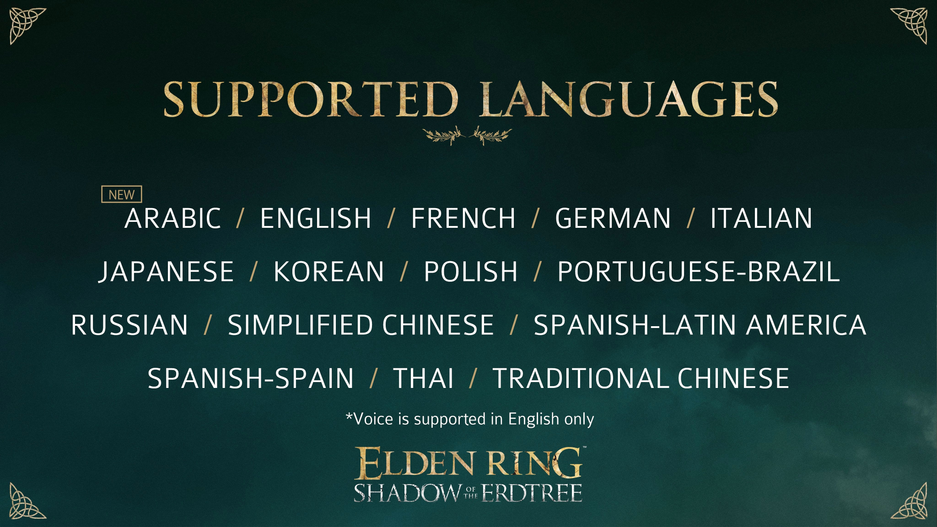 Появился список поддерживаемых языков Elden Ring Shadow of the Erdtree — русский в наличии (имеется ввиду текстовый перевод, озвучка будет представлена лишь на английском языке)