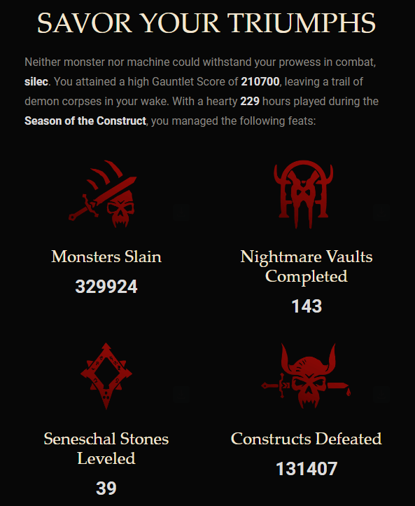 Пример персональной статистики: сообщают о количестве убитых монстров и уничтоженных конструктов; числе развитых камней Сенешаля и прохождений Кошмарных хранилищ; проведённом в игре времени и максимальном количестве очков в Череде испытаний.