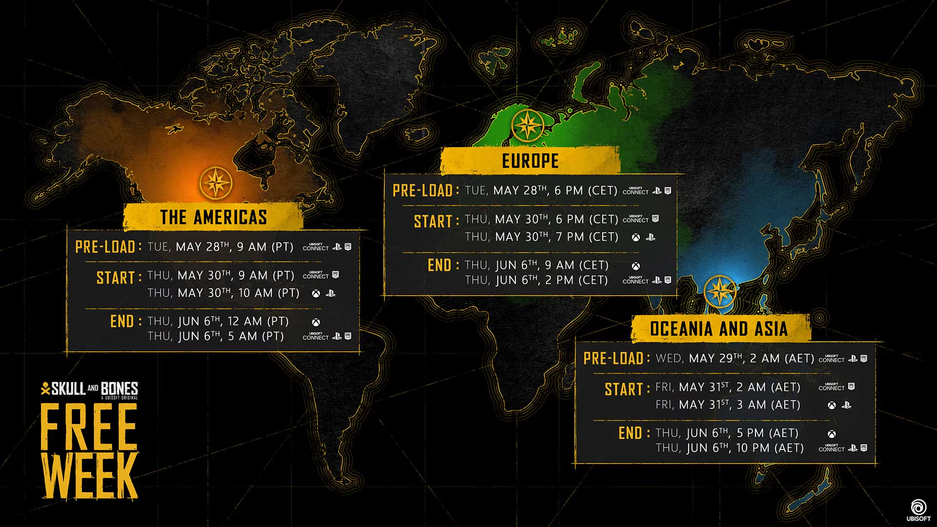 Ожидается, что с 30 мая в Skull and Bones начнётся неделя бесплатного доступа, которая продлится до 6 июня. Предварительная загрузка начнётся одновременно с запуском сезона, т.е. 28 мая.