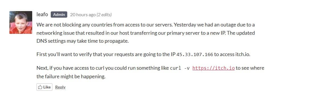 Один из администраторов портала отметил, что проблема может быть связана с DNS, поскольку вчера был сбой именно на стороне itch.io, однако комментаторы утверждают, что DNS не имеет никакого отношения к доступности сайта.