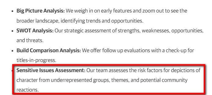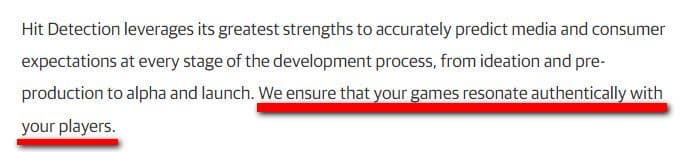 Судя по описанию деятельности Hit Detection на ее официальном сайте, эта контора занимается тем же самым, что и Sweet Baby: продвижением повестки в играх, заменой цвета кожи, веса и прочих характеристики персонажей, а также переписыванием сценариев с учетом современной политической ситуации в реальном мире.