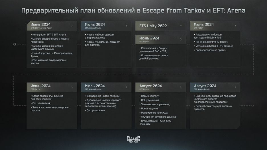 Представили дорожную карту на июнь – августа 2024 года. В этом месяцев ожидается интеграция основной Escape from Tarkov и сессионного шутера EfT Arena, новый торговец — Распорядитель Арены, а также специальные внутриигровые квесты.