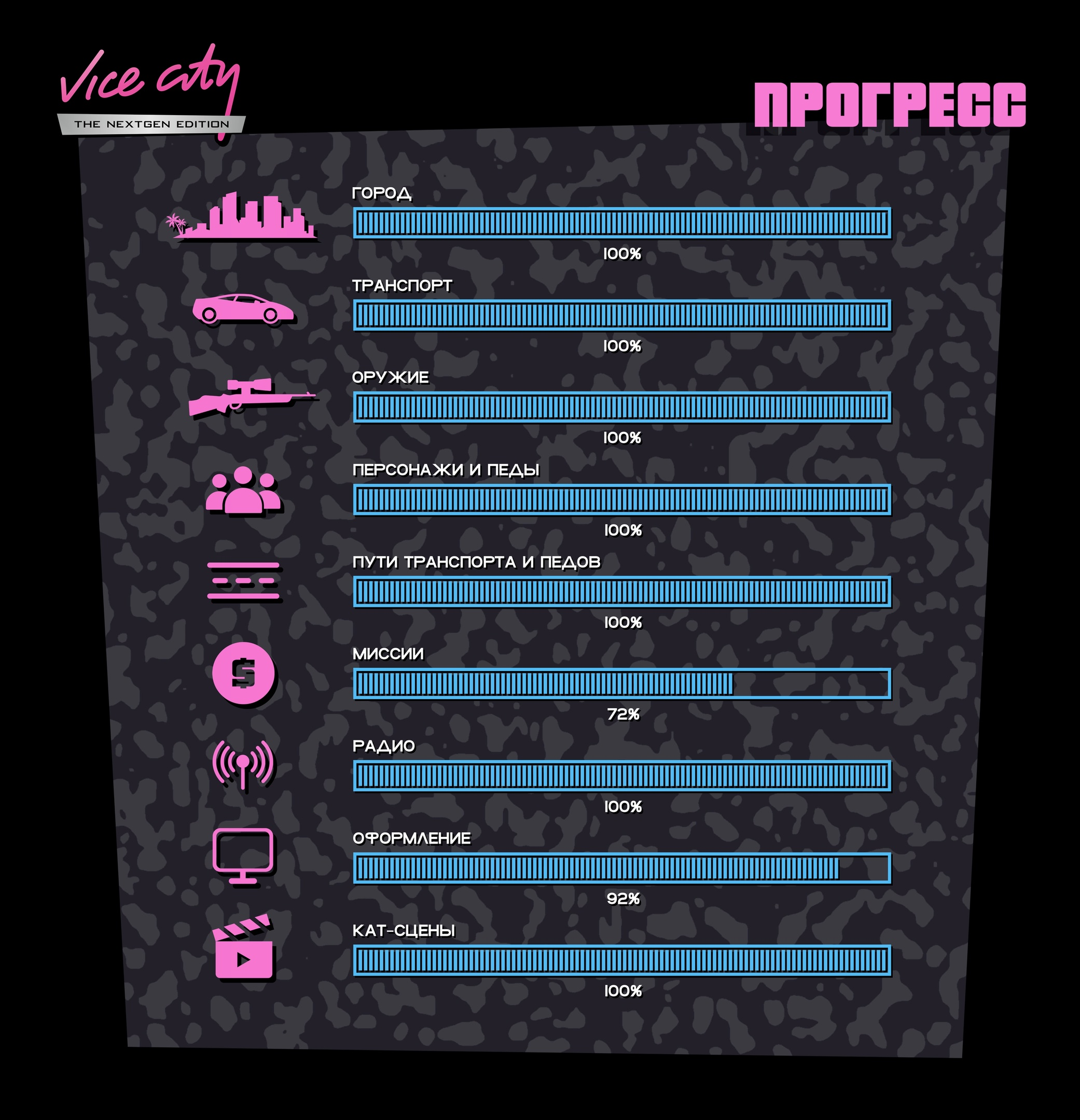 Также команда GTA Vice City Nextgen Edition решили рассказать о том, как продвигается работе. По состоянию на май 2024 года картина следующая: разобрались с городом, транспортом и оружием, персонажами и педами (пешеходы), путями транспорта и педов, радио и катсценами, работа идёт полным ходом: