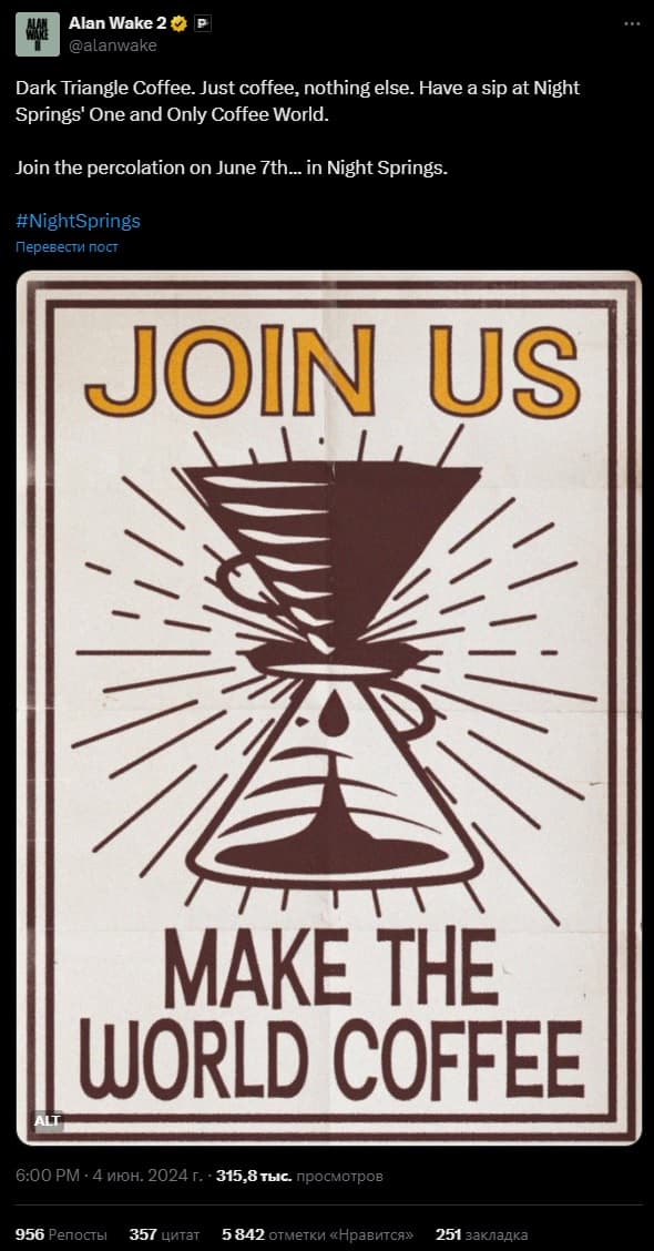 Remedy Entertainment опубликовала сообщение, призывающее игроков отправиться в Night Springs, чтобы выпить кофе 7 июня.