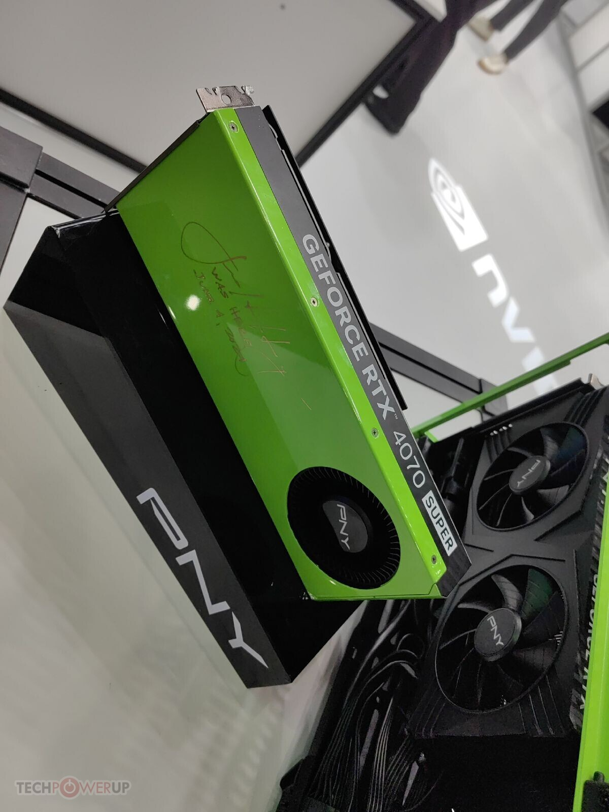 Внимание менеджера привлекла местная GeForce RTX 4070 Super, выполненная в ярком зелёном дизайне. Хуанг решил оставить свой «автограф» — получилось так, словно устройство получило одобрение самого босса NVIDIA.