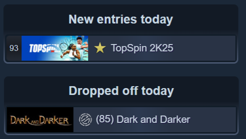 Однако продержалась она в списке не очень долго, история получила неожиданное продолжение. Такая антиреклама Dark and Darker сработала: на проект обратили внимание новые пользователи и рейтинг начал расти. Зато в список худших попал апрельский релиз — симулятор тенниса TopSpin 2K25 от 2K, которая известна по агрессивной монетизации спортивных игр.