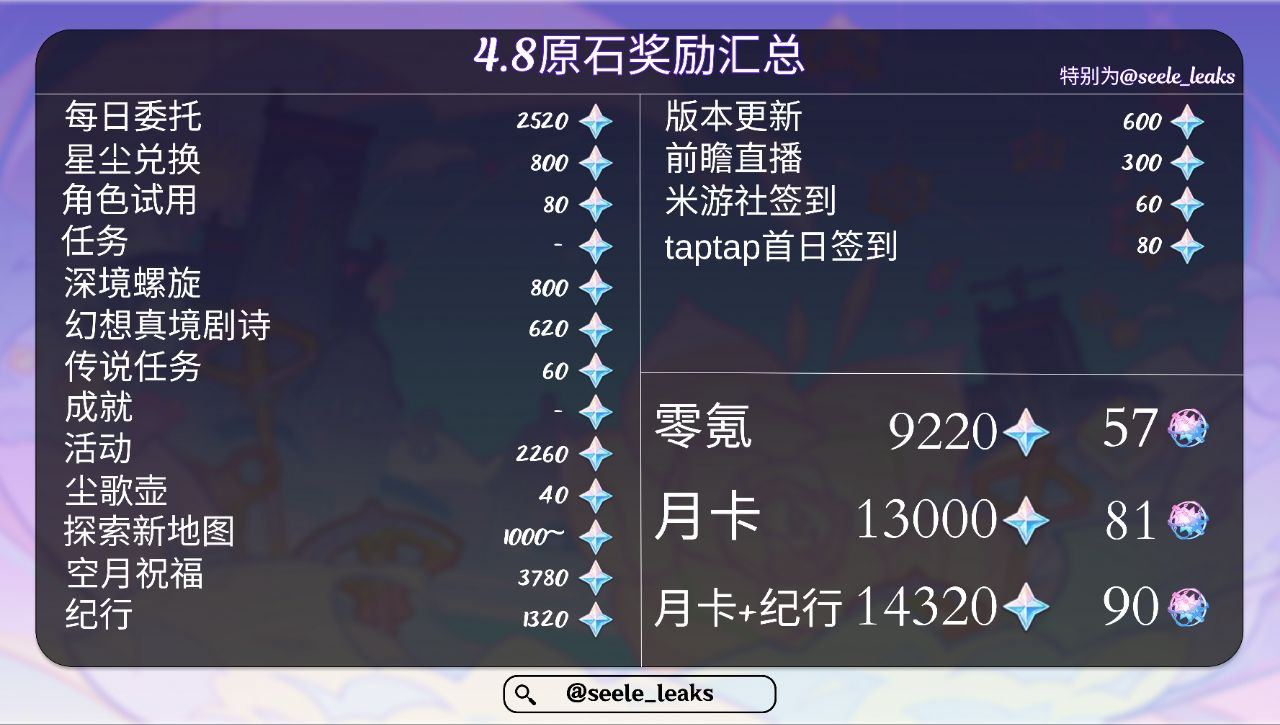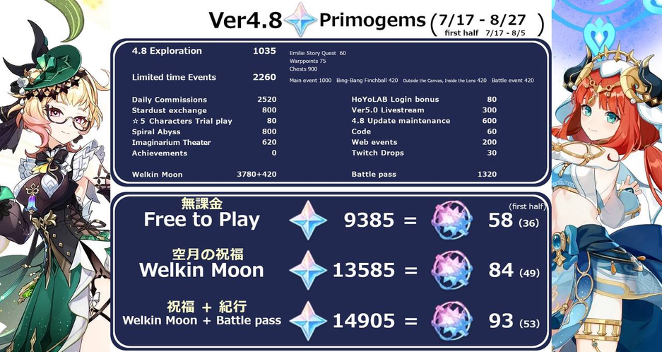 Сообщество Genshin Impact примерно подсчитало, сколько всего примогемов (Камней истока) можно будет заработать в обновлении 4.8. Результаты вычислений затем для удобства были переведены в «крутки». В этот раз в наличии пара версий подсчётов, результаты которых немного отличаются. Учитываются как внутриигровые способы получения, так и «внешние», вроде просмотра трансляции разработчиков (активация промокодов), компенсации за технические работы и т.д.