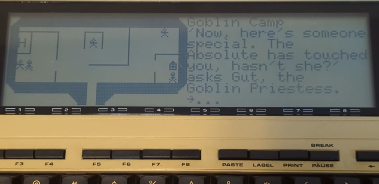 В качестве целевой платформы он выбрал TRS-80 Model 100 — один из первых когда-либо выпущенных ноутбуков (начало 1980-ых). Естественно, не стоит ожидать графику уровня актуальной Baldur’s Gate 3 — она выглядит следующим образом, всё здесь «рисуется символами».