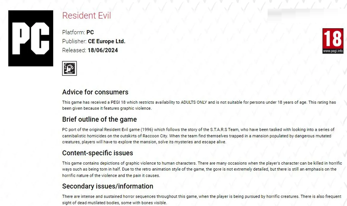 Внезапно про самую первую Resident Evil снова вспомнили в 2024 году — поводом послужило повторное получение игрой возрастного рейтинга на ПК.