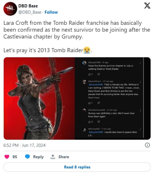 Dead by Daylight известна тем, что в ней появлялись персонажи из различных вселенных хорроров и поп-культуры, включая Майкла Майерс, Фредди Крюгер и совсем недавно Пирамидоголового из Silent Hill. Добавление в игру Лары Крофт открывает новые возможности для геймплея и стратегии с уникальными навыками и стилем выживания, характерным для персонажа.