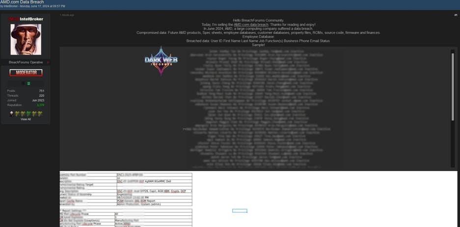 Издание Bloomberg сообщает, что AMD могла стать жертвой хакерской атаки, в результате которой злоумышленники получили доступ к большому количеству конфиденциальных данных. Кроме того, информатор DarkWebInforner утверждает, что IntelBroker уже пытается продать украденную информацию на специализированных форумах. Среди украденных данных: