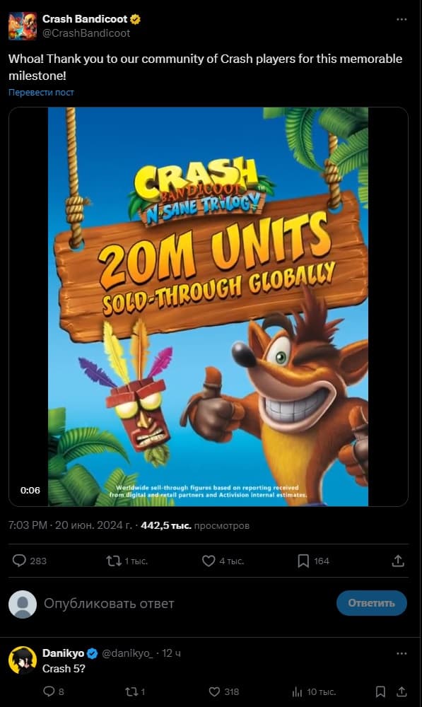Официальный аккаунт Crash Bandicoot поблагодарил фанатов, которые, в свою очередь, сразу же попросили пятую часть серии.