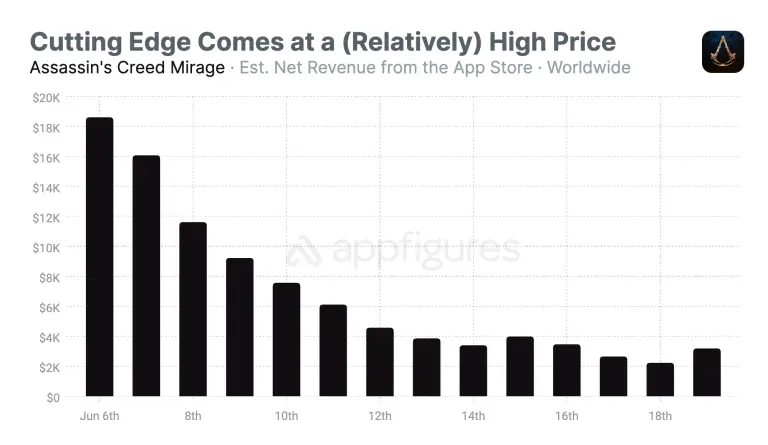 Аналитики AppFigures сообщают, что Assassin's Creed Mirage была загружена пользователями около 123 000 раз. Количество загрузок обеспечила бесплатная ознакомительная версия, но их конвертация в продажи незначительная — приобрести проект решилось менее трёх тысяч человек. Таким образом, Mirage заработала $138 000 при стоимости в $49.99.