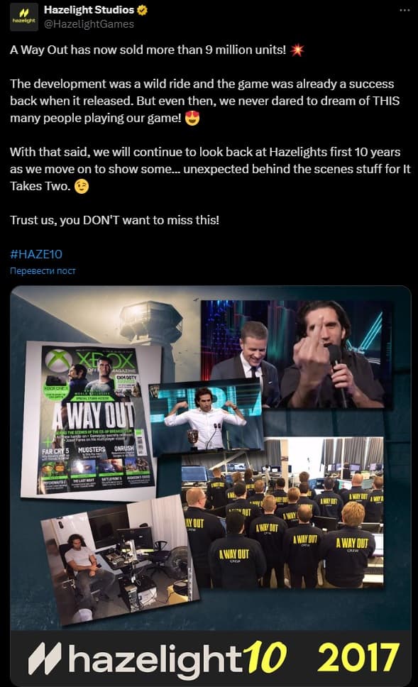 «Разработка A Way Out была безумием, и сразу после выхода игра стала успешной. Но даже тогда мы и мечтать не смели, что в нашу игру будет играть ТАКОЕ количество людей!»