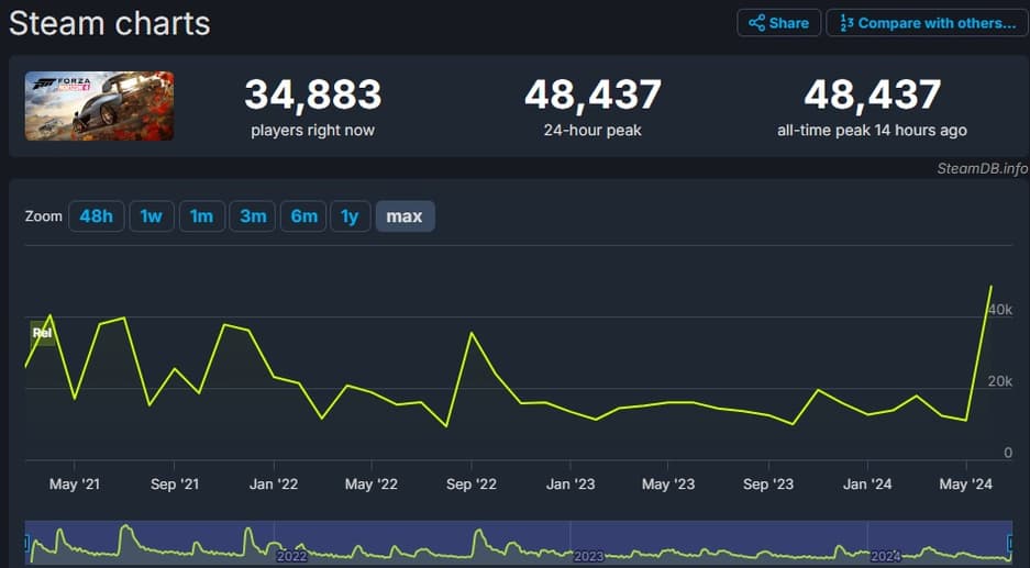 Всего через два часа после объявления об исключении из списка Forza Horizon 4 достигла нового пика - 48 437 одновременных игроков в Steam. Этот показатель превзошел предыдущий рекорд в 40 399 игроков, установленный в 2021 году, что говорит о всплеске активности, вызванном реакцией сообщества на новость.