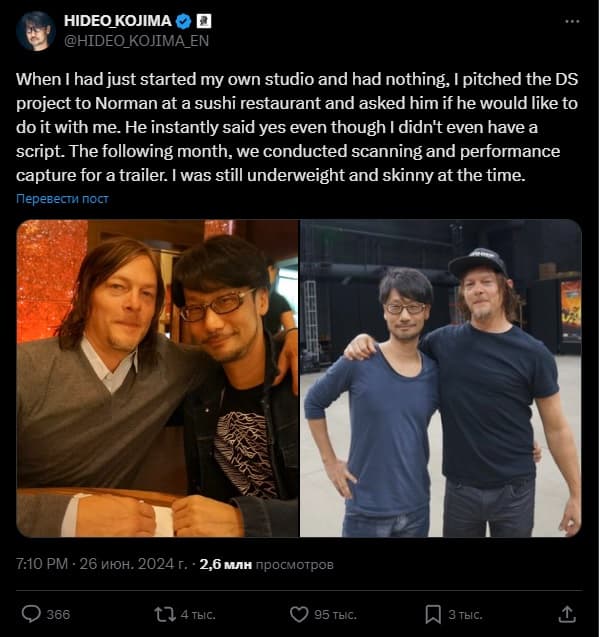 «Когда я только основал свою студию и у меня ничего не было, я представил проект Death Stranding Норману в суши-ресторане и спросил, не хочет ли он принять участие. Он сразу же согласился, хотя у меня даже не было сценария».