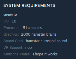 Дело в том, что он случайно отправил в сервис Valve «хомячьи» системные требования (оставил заглушку). С удивлением для себя он обнаружил, что на странице Bat to the Heavens в Steam для запуска игры в графе с процессором указано «пять хомяков», а напротив видеокарты «2000 хомячьих мозгов», в качестве дополнительной информации стоит «надеюсь, что сработает».
