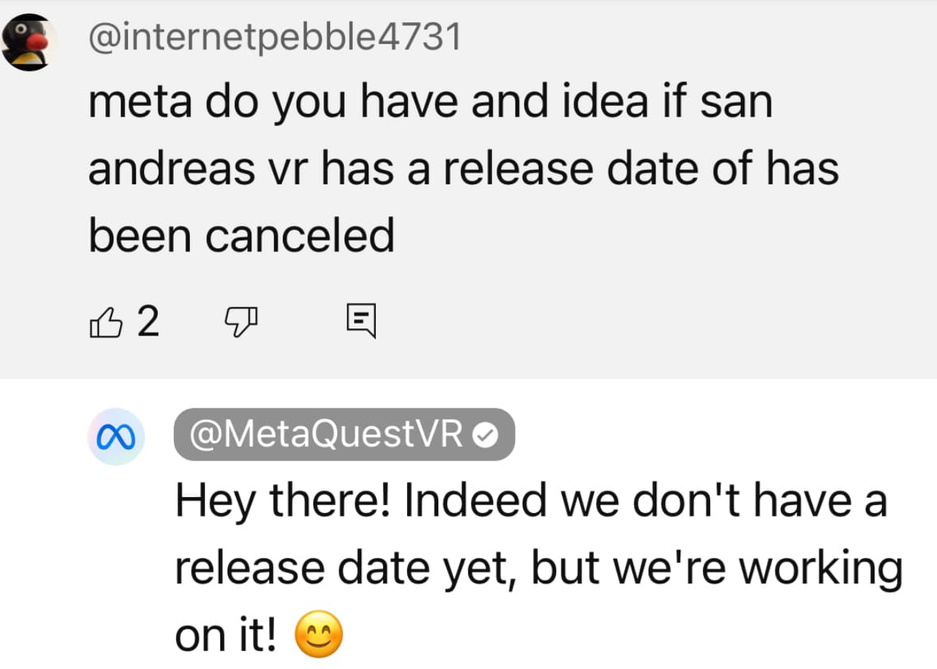 Сперва это восприняли как подтверждение разработки Grand Theft Auto San Andreas VR, но затем комментарий представителя Meta* был удалён, что породило вопросы у сообщества VR-энтузиастов.