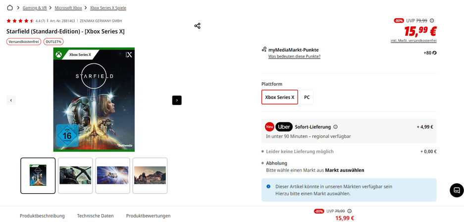 Некоторые магазины пытаются продавать диски Starfield по низким ценам. На летней распродаже в Steam предлагают скидку 30-33% в зависимости от изданий, а в некоторых магазинах копию для ПК / Xbox Series продают с 77-80% скидкой за 16 евро.
