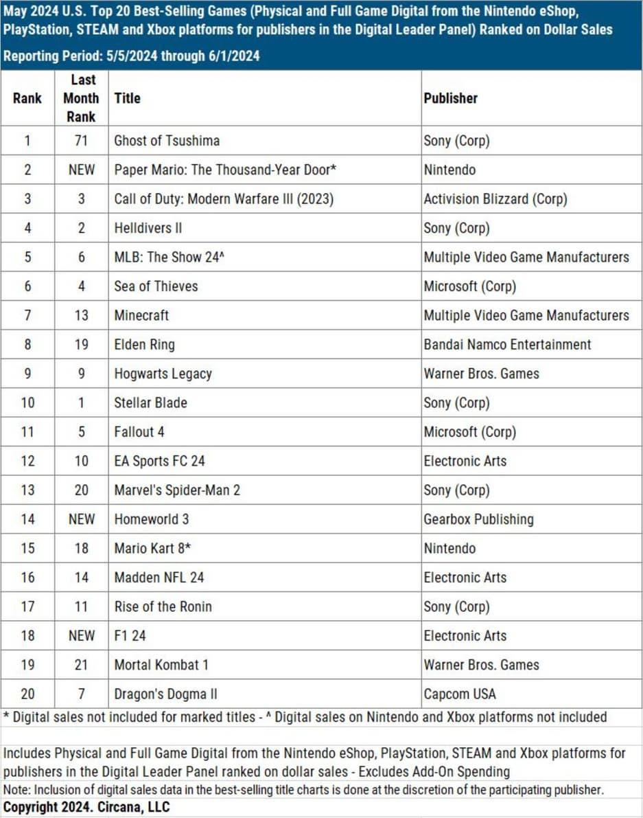 Ghost of Tsushima, приключенческая боевая игра с открытым миром, разработанная Sucker Punch Productions и изданная Sony Interactive Entertainment, возглавила продажи игр в США в мае, согласно данным NPD Group.
