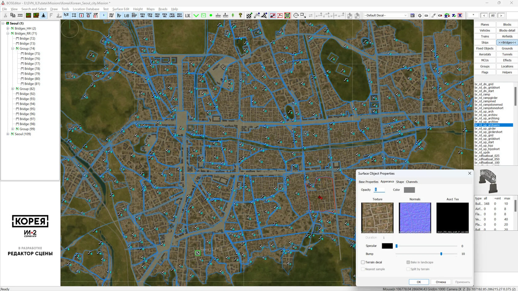 Дороги и населённые пункты, по тем же причинам, воссоздаются заново и полностью вручную - планировка городов и дорожной сети за 70 лет изменилась до неузнаваемости. Вся эта огромная работа сейчас уже подходит к своему завершению и вскоре мы полностью сосредоточимся на создании сцен аэродромов и городов. В составе дорожной сети уже установлено более 1460 мостов, а скоро мы приступим к задаче расстановки на карте нового для нас типа объектов - работоспособных туннелей».