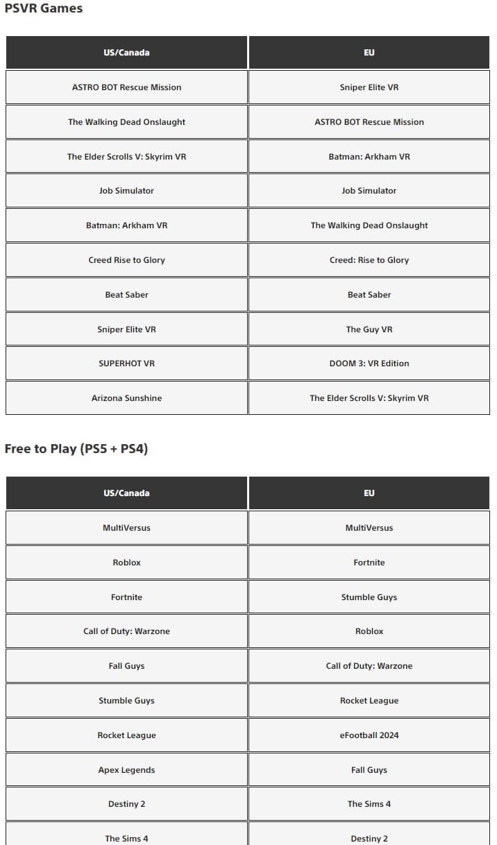 Среди других ярких примеров - MultiVersus, самая скачиваемая условно-бесплатная игра на PS4/PS5, Beat Saber, ASTRO BOT Rescue Mission и Sniper Elite VR.