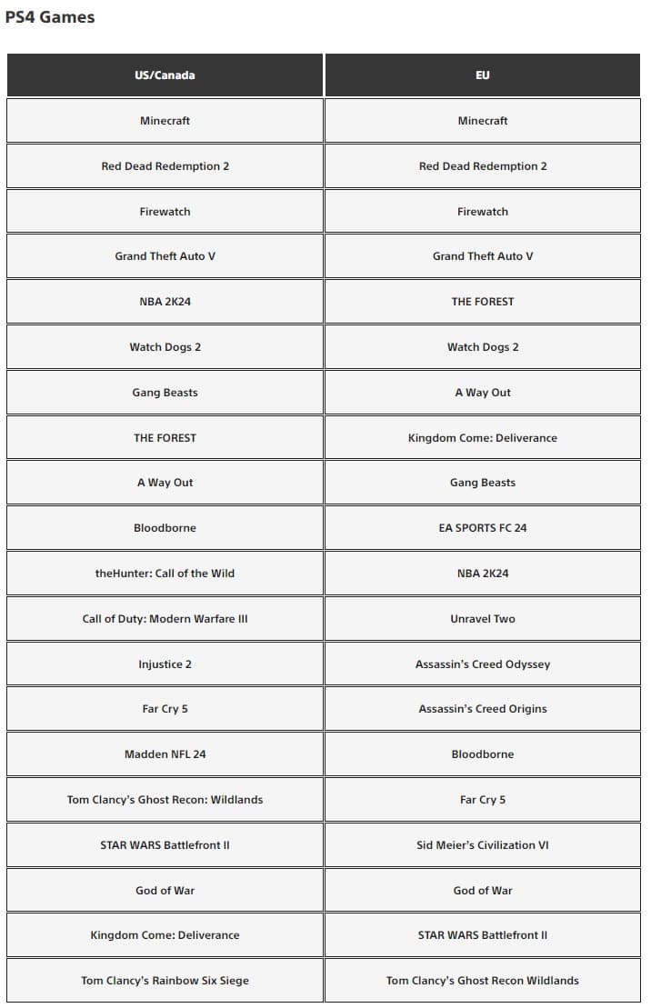 Что касается PS4, то четверка самых скачиваемых игр одинакова как в Европе, так и в США/Канаде. Золотую медаль завоевала Minecraft, за ней следуют Red Dead Redemption 2, Firewatch и GTA 5.