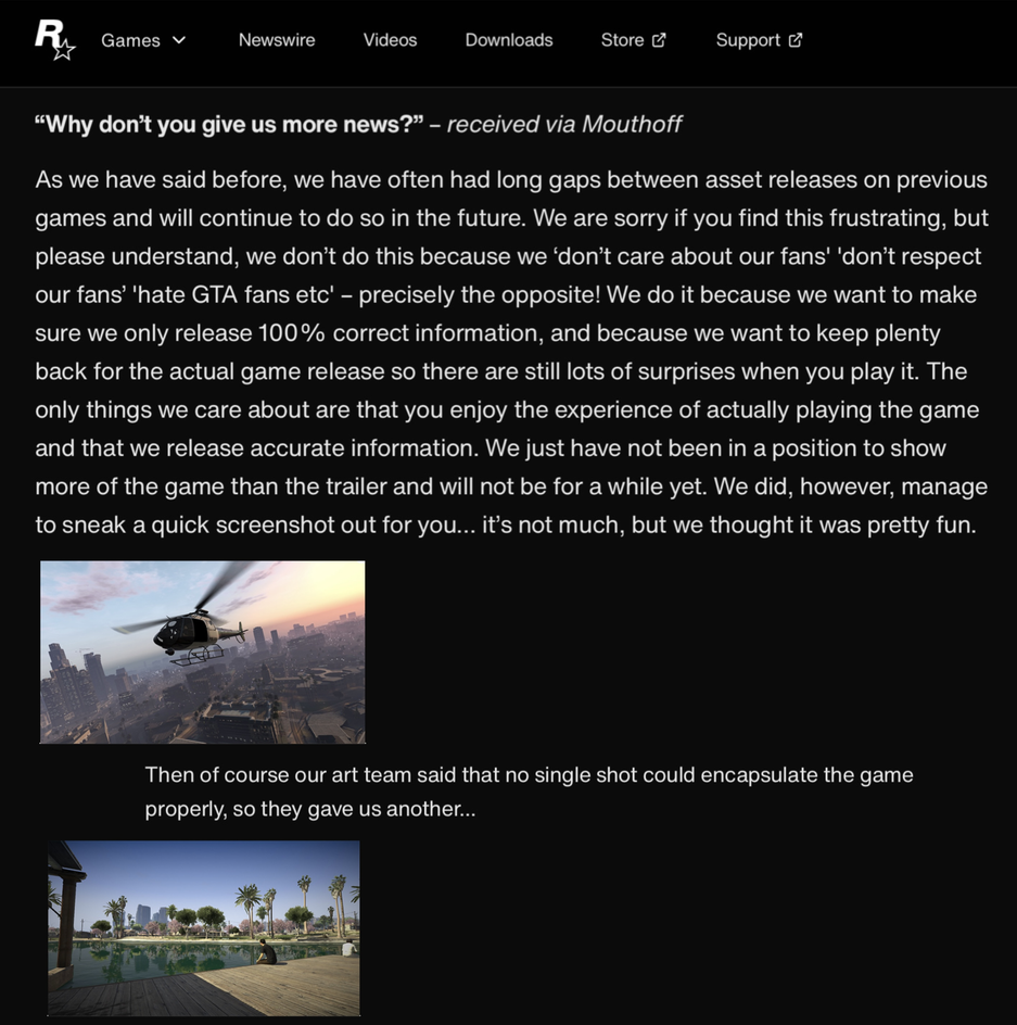 «...мы часто делали большие перерывы между выпуском [новостей] и будем делать так и в будущем. Мы сожалеем, если вас это расстраивает, но, пожалуйста, поймите, мы делаем это не потому, что "не заботимся о наших фанатах", "не уважаем наших фанатов", "ненавидим фанатов GTA и т. д." — как раз наоборот!