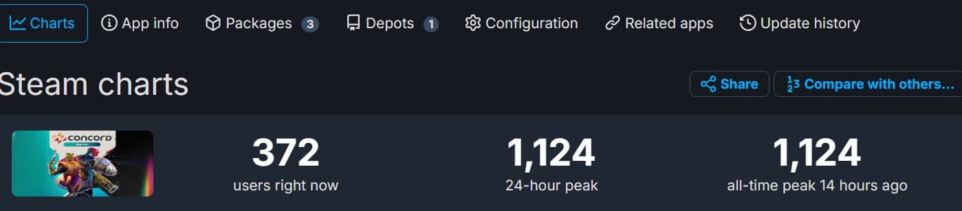 Согласно статистике, в ПК-версию закрытой беты Concord на пике играло чуть больше одной тысячи человек. Важно отметить, что бета доступна также на PlayStation 5 всем обладателям подписки PlayStation Plus, но маловероятно, что статистика на консоли Sony лучше.